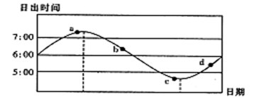小题2:在图中b点对应的日期,北半球的北京日出时间晚于6点,说明太阳直射在南半球,从图上可以看出b点对应的日期往后日出越来越早,越来越接近6点,说明太阳直射点向北移动,越来越靠近赤道,应为2月左右,可能发生的现象是全球华人欢度春节。答案选B。