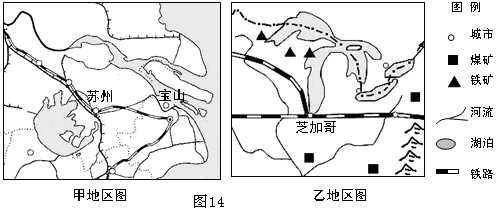 本题解析:本题考查局部区域比较。结合图示的海陆轮廓和重要的地理事物判断:甲表示我国的长三角地区,乙表示美国五大湖周围。