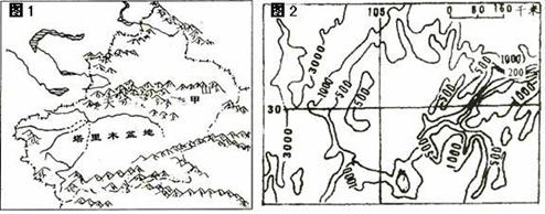 (1)图1中甲处所表示的盆地是?,图2表示的盆地是?。