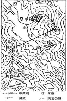 【小题4】图中虚线是规划在几个村庄之间修建的公路,乙村到甲村的线路比较平直,乙村到丙村的线路比较弯曲,呈“之”字型。这样规划能反映出山区公路建设中应遵循的原则是(   )
