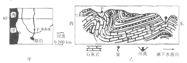小题1:读图,根据甲图中的等高线判断,河流由南向北流,湖泊是源头。选项B对。根据乙图中的河流剖面判断,右岸侵蚀严重,说明河流位于北半球,P地位于北纬30°-40°的大陆西岸,属于地中海气候区,冬季降水较多,是主要的补给水源,选项A错。根据乙图中的岩层状况判断河谷处地质构造是背斜,C错。图中湖泊水向处流,不会造成盐分积累过多,是淡水湖,D错。