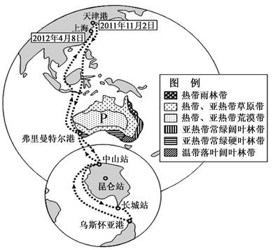 材料一?我国南极科考队于2011年11月2日从天津国际邮轮母港出发,启动了中国第28次南极科考。此次航程中,“雪龙”号科考船承担了中山站、长城站、昆仑站“一船三站”的后勤保障和大洋考察任务。于当地时间2012年3月6日17时在中山站(经纬度约为690S,760E)启程回国。