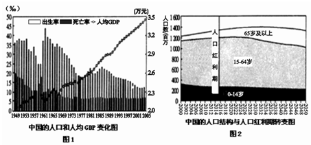 5、单选题 人口红利期指的是在一个时期内,社会抚养指数相对较小,总人口中劳动适龄人口比重较大。20世纪80年代,我国开始进入人口红利期,人口红利为我国经济发展带来丰富的劳动力资源,使消费率降低、储蓄率提高、投资高速增长。图1为中国的人口和人均GDP变化图,图2为中国的人口结构与人口红利期转变图。据此回答下列各题。