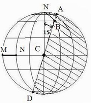 (4)图示时刻北京时间为7月某日11时20分,比正午时刻晚40分钟,地球自转1度4分钟,由此可知地方时12:00的经度=120o+40/4=130oE;图中昏线与地轴夹角为15o,且北极是极昼,太阳直射纬度为15oN。