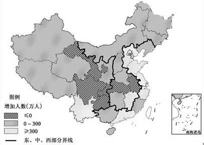 5、单选题  下图是2000-2010年我国人口变动情况分布示意图(不舍港澳台数据)。读图回答问题。