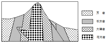 1、单选题 下图为某地区地质剖面图。地质工作者调查发现,该地区4种岩石中最古老的是石灰岩。读图,完成下列各题。