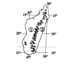 2、单选题 马达加斯加地广人稀,水稻种植有着得天独厚的优越性,全国各地都有栽培,但仍不能完全自给。读图,回答1—2题。