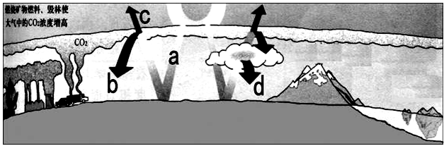 【小题1】温室效应的形成主要是大气的温室气体(主要是CO2)强烈吸收太阳辐射中的红外线能量和地面辐射能量(地面辐射为长波辐射,辐射能力最强集中在红外线),从而把能量保留在大气中,并通过大气逆辐射把能量传给地面,对地面实现了保温的作用。图示b表示大气吸收太阳辐射能量,d表示大气逆辐射。C正确。