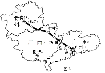 5、单选题 贵广铁路(见图3)是“十一五”规划的重点项目,全长857公里,设计时速200公里。项目建成后,乘火车从贵阳到广州的时间将从原来的20个小时左右缩短至6个小时左右。据此回答第3题。