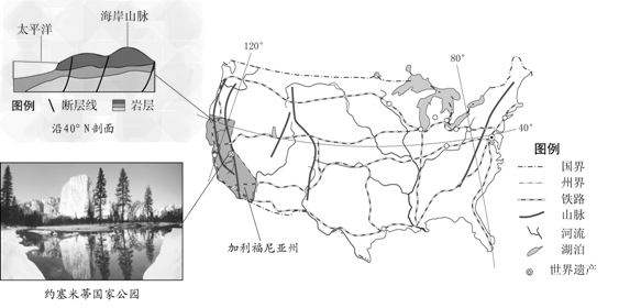 (1)在美国铁路特点中任选其一,说明其形成原因。
