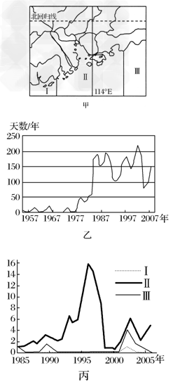 材料三:灰霾是指空气中悬浮着大量极细微的烟、尘粒等颗粒物,能见度小于10千米的大气现象,灰霾正成为珠江三角洲地区的一种常见天气。(注:图乙是广州市1957—2007年灰霾天数分布图,图丙是图甲中Ⅰ、Ⅱ、Ⅲ三地赤潮发生次数曲线图。)