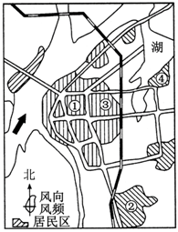 小题2:①位于市中心布局中心商务区,正确;②位于主导风向的垂直郊外,对城市的环境小,且靠近铁路,交通便利,布局冶金工业区,合理;③接近市中心和铁路,环境污染较重,故为低级住宅区;④位于主导风向的上风向,接近湖泊,环境优美,故为高级住宅区。