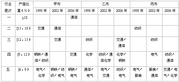 ? 另两市进行转移。以钢铁工业为例,甲市由1998年的第四层次,下降到2002年、2006年的第五层次;