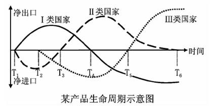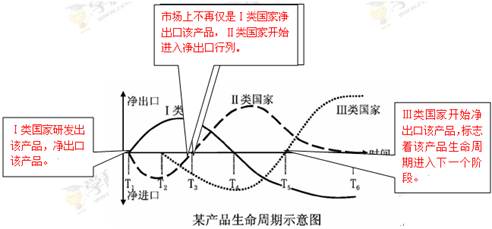小题1:当有不同类型的国家净出口该产品时,则该产品的生命周期进入下一个阶段。这一句话是解答此题的关键所在。如图所示, T3、T5把该产品的生命周期划分为三个阶段,则T1-T3属于新产品阶段,T3-T5属于成熟阶段,T5以后是标准化阶段。
