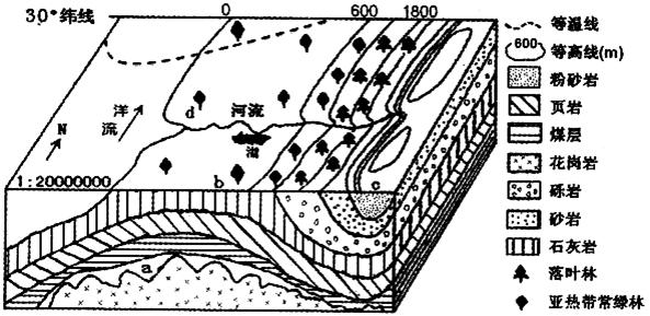【小题1】c位于向斜的槽部,岩石坚硬,不易侵蚀,④错;b处是背斜,是地下储油的地质位置,②正确;c是向斜,不适合挖地下隧道,③错;a在花岗岩附近,在岩浆活动产生的高温条件可能发生变质作用,①正确。
