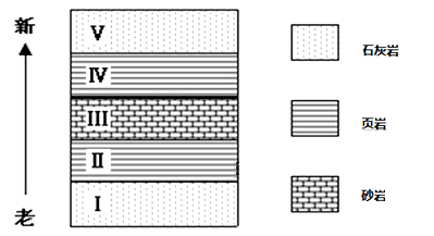 通过读材料:同一时期在海洋中形成的岩石,水平方向上由浅海到深海依次形成的是砂岩、页岩、石灰岩。再经过读图:在I→V地质时期中,该海域海岸线的变化:I→III海退(由深到浅),III→V海进(由浅到深)。因此选A项。
