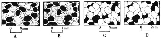 2、小明在“女王头”附近捡到一块岩体标本,制成薄片在显微镜下观察及测量,并判断其为砂岩。"那么观察到的岩石薄片最接近(图下方为比例尺)