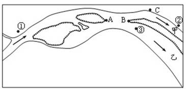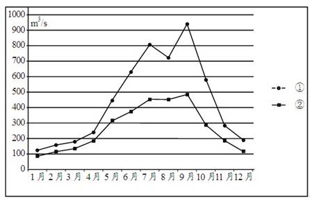 3、综合题 上图为某河段示意图,下图表示该河段上①、②两观测点所测得的年流量变化。阅读图文材料完成下列要求。