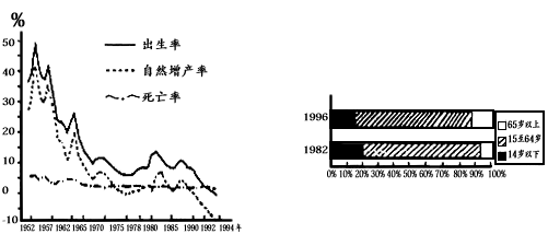 4、综合题 ? 读“上海市人口出生率、死亡率及自然增长率图”(左图)和“1982年与1996年上海市人口年龄构成比较图”(右图),回答下列问题。