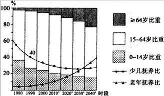 1、单选题 ? 抚养比又称抚养系数、负担系数。它是指人口中非劳动年龄人口数与劳动年龄人口数之比,以百分数表示。其计算公式是:抚养比=(非劳动年龄人口数÷劳动年龄人口数)×100%。非劳动年龄人口指14岁及以下和65岁及以上人口。劳动年龄人口指15~61周岁人口。下图为近70 年中国人口年龄结构每隔10年的变化统计图(带*年为预测数据)。读图回答1—3题。