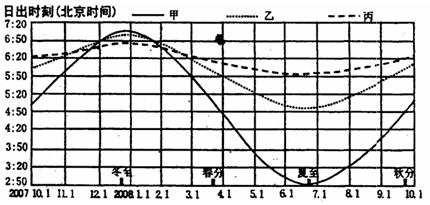 2、单选题 下图为我国甲、乙、丙三地2007年10月1日至2008年9月30日,日出时刻变化曲线图读图,完成下列各题。