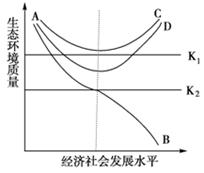 小题1:AB曲线显示随着经济水平的提高,生态环境质量呈快速下降趋势,且K2表示生态环境质量恶化警戒线,B点远低于K2线,这不是可持续发展的道路,也是最不可取的发展道路,正确答案选D。
