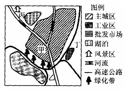 1.图中甲、乙、丙、丁四地,最适宜建高级住宅区的是2.图中批发市场区位选择最主要的原因是