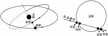 4、单选题 2012年6月6日最令人期待的天象金星凌日出现。金星的体积是地球的0.88倍,逆向自转(自东向西)。有时我们看到金星如一颗小黑痣,从太阳“脸上”缓慢走过,这种天象称为“金星凌日”。结合金星凌日发生示意图,回答下列各题。