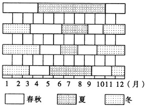 2、单选题 下图为我国北京、广州、武汉、哈尔滨四个城市的季节分配示意图。读图回答1~2题。