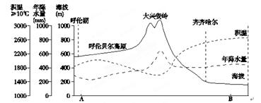 小题1:年降水最低区是因为距海远的影响,A错;积温最低值和年降水量的最大值均与地形(大兴安岭)有关,B错;A 地位于B地的西北方向,C错; 大兴安岭以西是草地,以东主要是耕地,山区以林地为主,D正确。