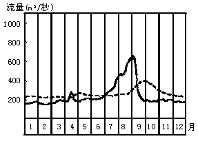 1、综合题  图表示我国一河流的水文站在建坝前后测得的流量曲线图。读图后回答: