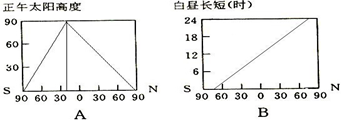 1、单选题 读下列正午太阳高度和白昼长度示意图,完成下列各题。