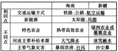 4、综合题 ? 海南省与新疆维吾尔自治区同为我国的边疆省区,前者位于沿海地区,岛内常规能源相对缺乏,目前正在推进国际旅游岛建设。后者位于内陆地区,生态环境建设成为该区域可持续发展的重点。读下列材料,回答问题。