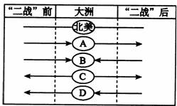 (3)在图里的“北美”两侧横线上加绘两个箭头,以表示其“二战”前后人口迁移的方向。