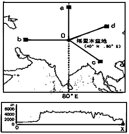 3、单选题 ? 下图示意以塔里木盆地中的某地为(O)点分别向四个不同方向约2000千米的a、b、c、d绘制地形剖面图,其中只显示出一幅地形剖面图。据此完成(1)——(2)题。
