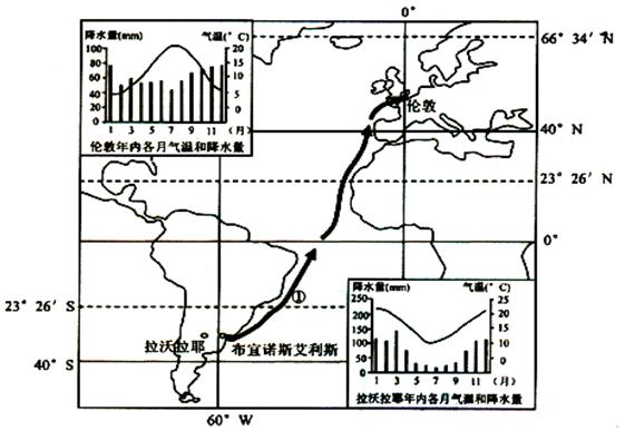 (1)一艘满载牛肉的轮船于当地时间2012年6月8日12时整,由阿根廷首都布宜诺斯艾利斯启航,沿图中箭头所示航线航行11天17小时,到达英国伦敦港的时间为6月 日 时,船员一路感受到日出时间是越来越 (早或晚)。
