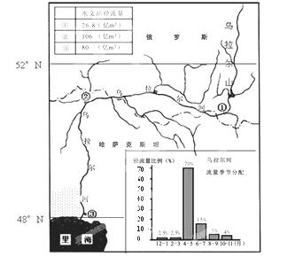 4、单选题 下图为“乌拉尔河水系示意图”,①②③为三个水文观测站。读图回答下列问题。