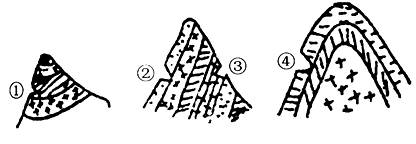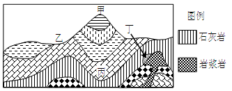 【小题1】甲处为向斜,不易储存石油,A错误;乙处顶部受挤压,岩层向上弯曲,易形成山岭,B错误;丙处为向斜构造,开凿隧道切断岩层,易出现坍塌、滑坡等,且地下水易顺岩层向中心渗漏,C错误;丁周围为石灰岩,东侧为岩浆岩,在岩浆活动过程中,石灰岩受热变质,形成大理岩,D正确。