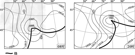 4、单选题  下图是某日08时和20时海平面气压分布图(单位:百帕)。读图,回答下题。