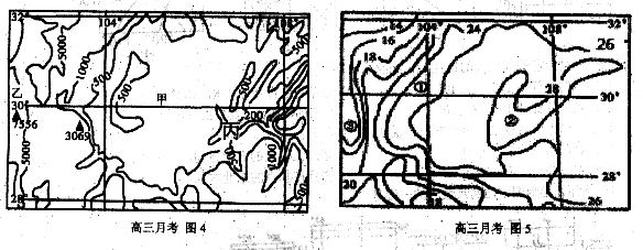 1、单选题 读下列两图(图4:我国某地等高线图:图5:我国某地七月等温线分布图),分析回答8~10题。
