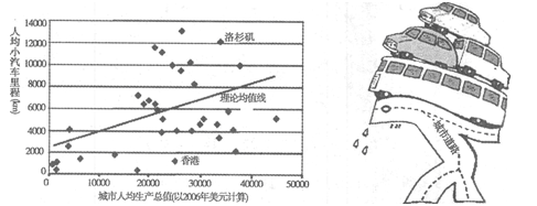 材料二:世界37个城市人均产值与人均小汽车里程?材料三:漫画《不堪重负》