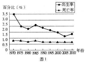 3、单选题 图1为我国1970~2010年人口出生率和死亡率统计图。回答问题。
