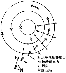 2、单选题 下图为“热力环流中某区域高空气压中心及风向变化示意图”,图中X、Y、Z为气压值。读图完成以下问题。