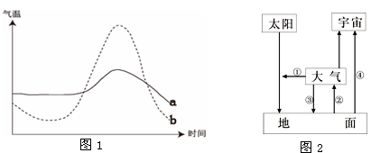 小题1:由图1可知,a曲线表示的昼夜温差小,b曲线表示的昼夜温差大;a曲线表示昼阴夜阴,b曲线表示昼晴夜晴;a曲线表示的昼夜温差小是因为白天云层对太阳辐射的削弱作用,夜晚大气对地面的保温作用,主要是受到①③的影响。