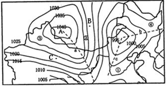 本题解析:本题考查等压线天气图的综合分析。(1)图示A处等压线闭合,中心气压高于四周,判断为高压中心,受高压控制,盛行下沉气流,天气晴朗。(2)a处为高压脊,不会形成锋面;根据北半球北方为冷空气,气旋的水平气流呈逆时针辐合,故判断b处形成暖锋。(3)图示B地、C地的风向,根据水平气压梯度力垂直于等压线,由高压指向低压,北半球向右偏,画出风向。(4)图示等压线越密的地方,水平气压梯度力越大,则风力越大。
