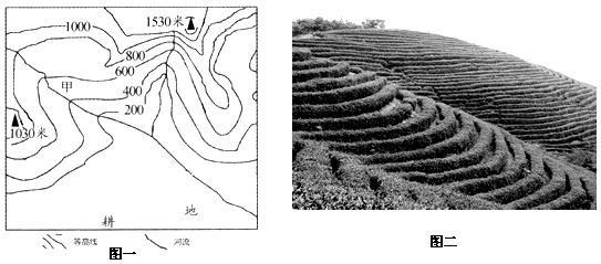 “好山好水出好茶”,茶叶的生长分布、质量高低与地理环境密不可分。茶叶具有喜酸怕碱、喜光怕晒、喜温怕寒、喜湿怕涝的典型特点。图一为我国东南某区域等高线地形图。图二为甲处茶园景观图。(9分)