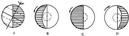 本题解析:北半球的夏至日是北极圈有极昼现象。南极圈有极夜现象。图中B地球自转呈逆时针方向,是北半球。选择B项。