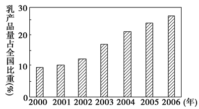 (3)目前,该地形成了一条绵延上千千米的“奶牛带”,饲养着130多万头奶牛,是全国最大的优质奶源基地。这条“奶牛带”上分布着100多家乳品加工企业。结合下图说出该地区乳品加工业的工业布局类型名称,简述该地区乳产品产量发生的变化及原因。