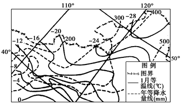 (1)说出图示区域1月气温及年降水量的总体变化趋势;简述其形成的主要原因。