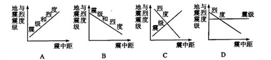 小题4:本题考查烈度的影响因素。烈度与地震的震级、震中距、震源深度等有关。其中震级越大,烈度越大;震中距越近,烈度越大。符合的是D项。